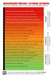 C’est ce que propose notre nouvel outil : l’échelle de la grossophobie médicale, un violentomètre conçu par Gras Politique pour aider les personnes grosses à identifier les violences qu’elles subissent dans le système de santé.